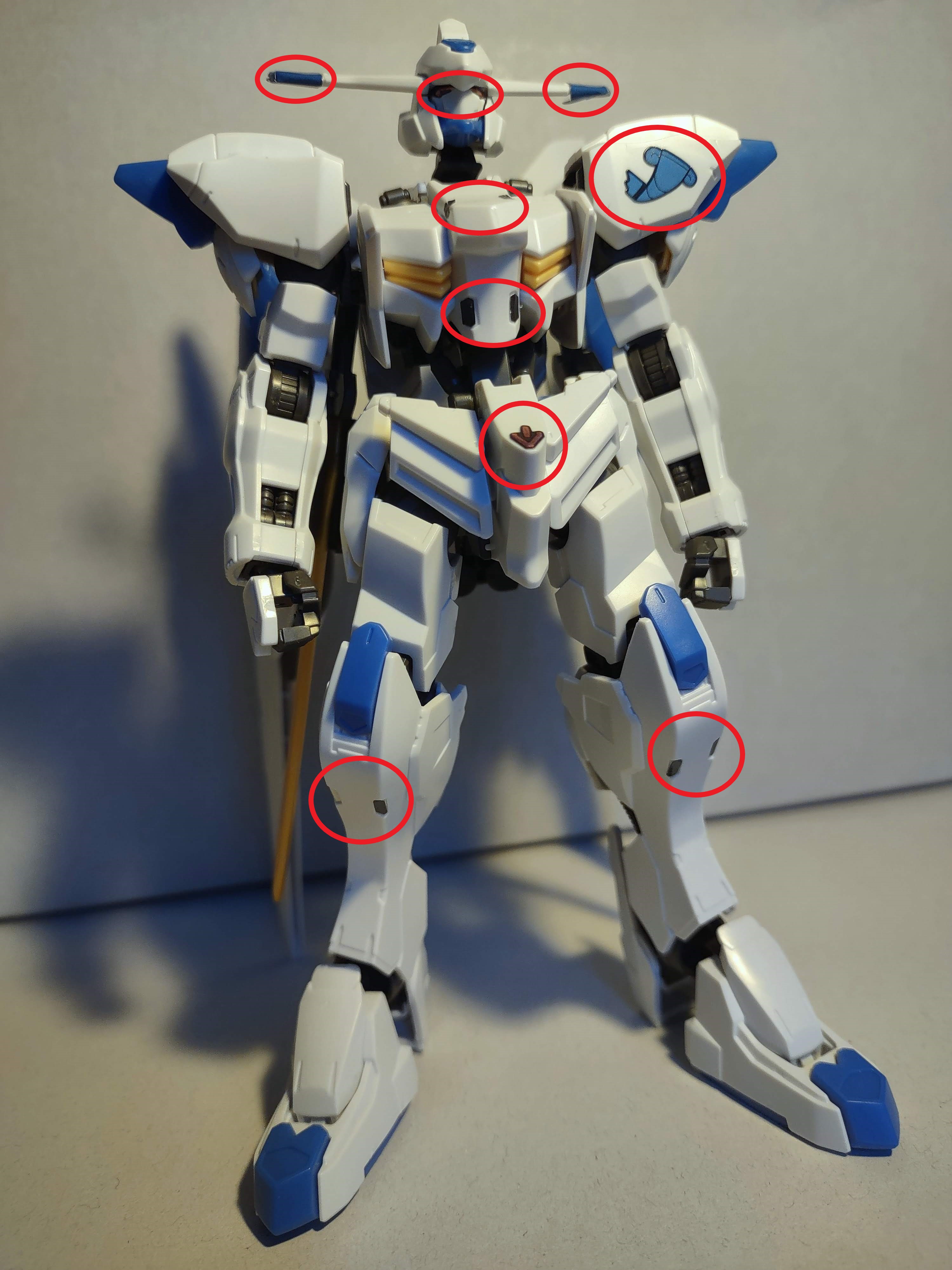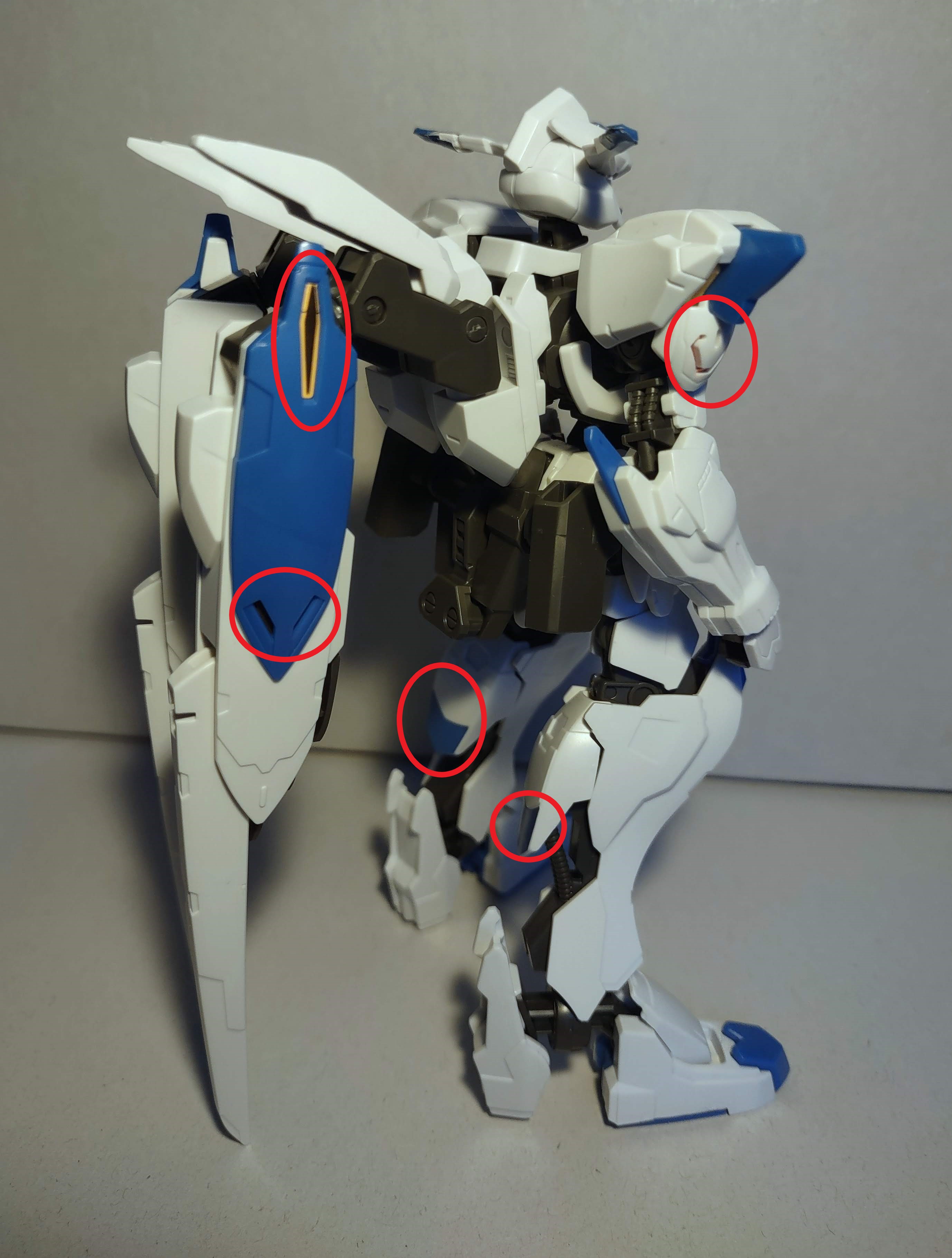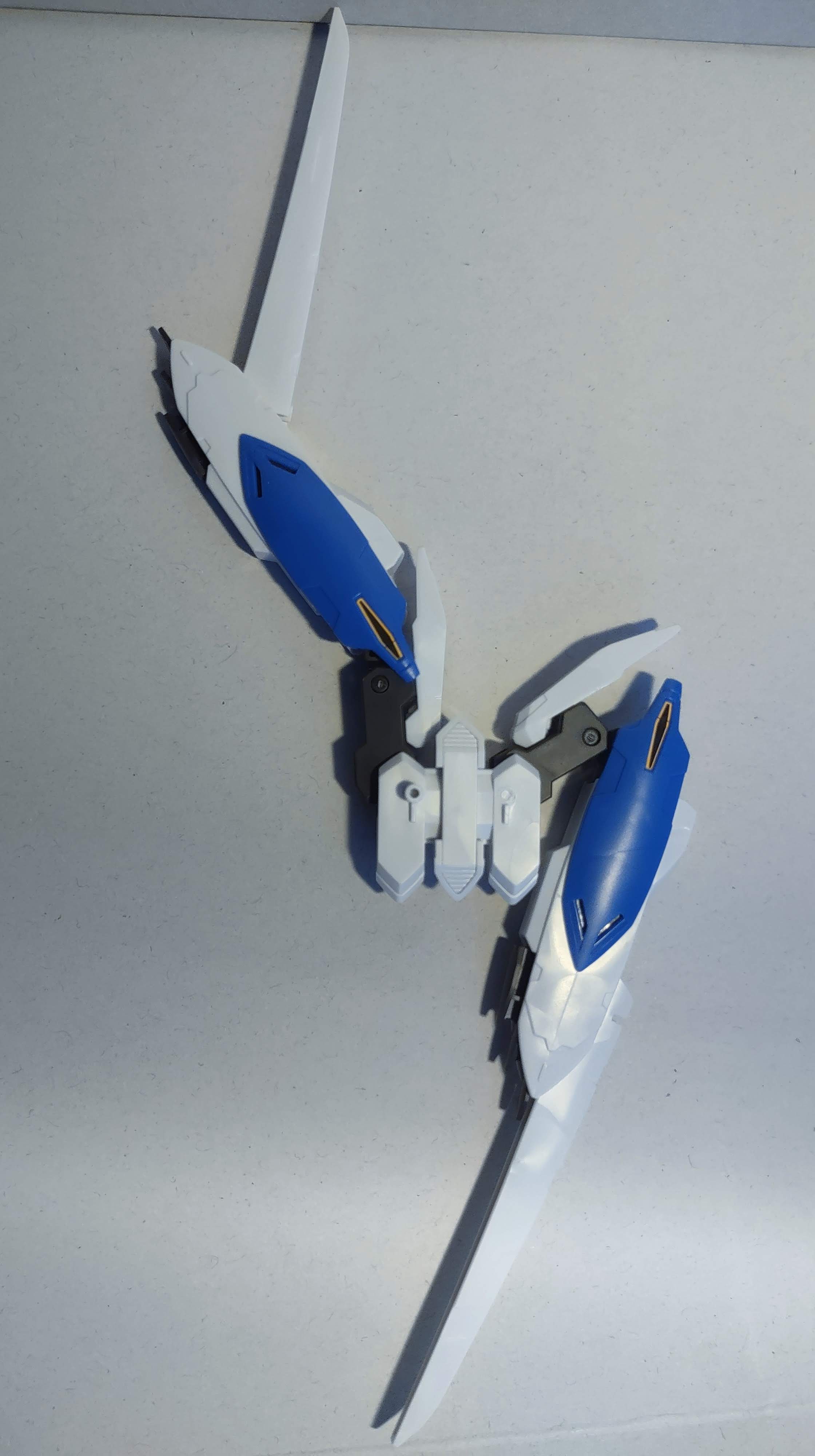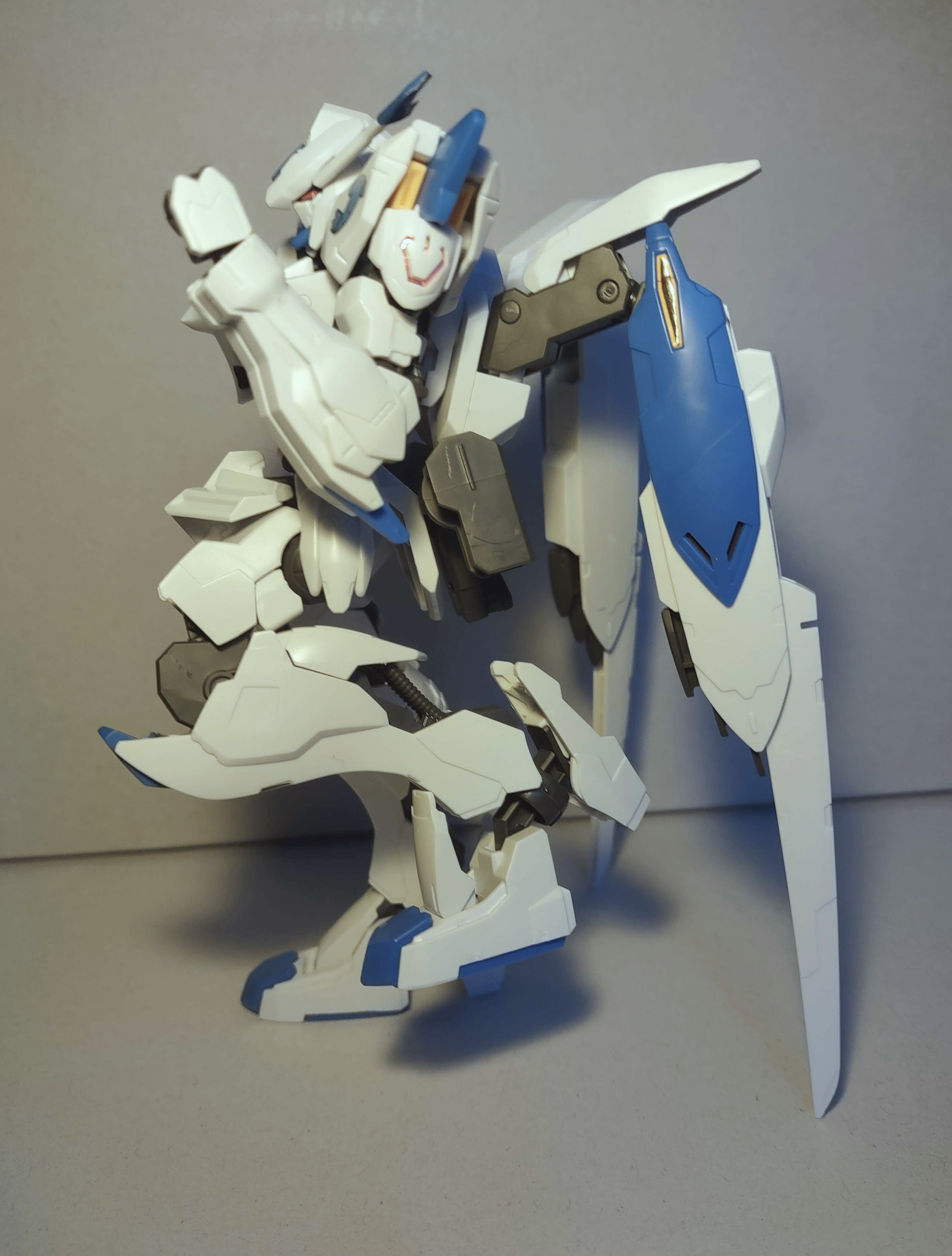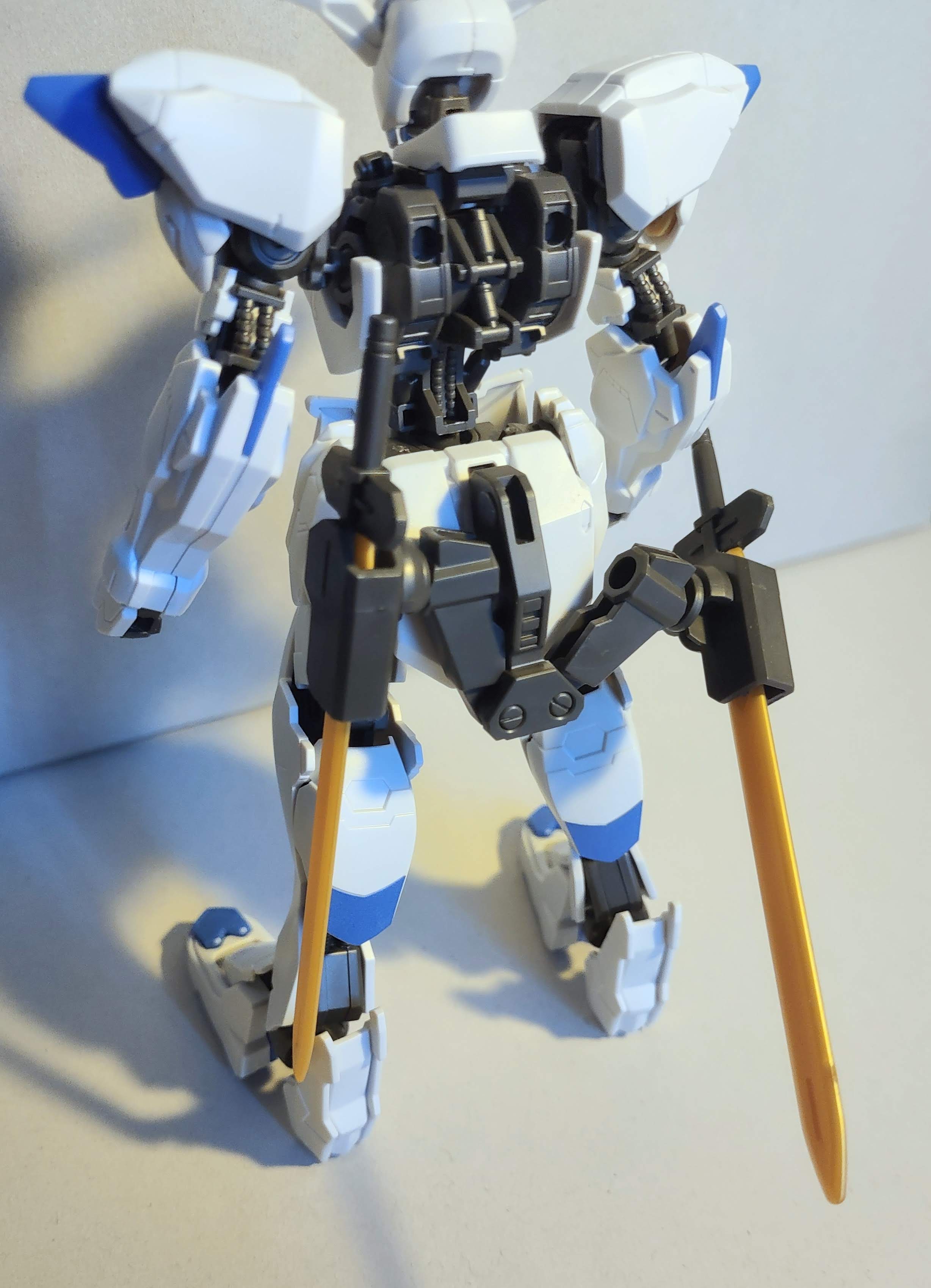 This model shares the same internal Gundam frame as the other IBO Gundam kits, so the main body’s articulation is similar. Overall, the articulation is solid and you can get some good dynamic action poses, but the single-jointed elbows and very short upper legs may be a bit limiting depending on the pose you want to pull off. The wing binders and sword holsters are articulated as well, providing you with more options. The kit can hold poses pretty well out of the box, but it is worth mentioning that I have one other HG IBO kit, and it has loosened a lot over time, making it harder to hold poses.